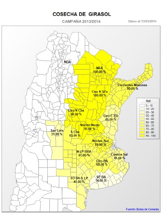 En el Norte de La Pampa y Oeste de Buenos Aires el cultivo de girasol también sufrió la falta de lluvias y el efecto de isocas que en muchos casos no llegaron a controlarse. No obstante, el cultivo respondió de buena manera y hoy por hoy la cosecha presenta un progreso superior al 60 % con un rinde medio de 21 qq/Ha.