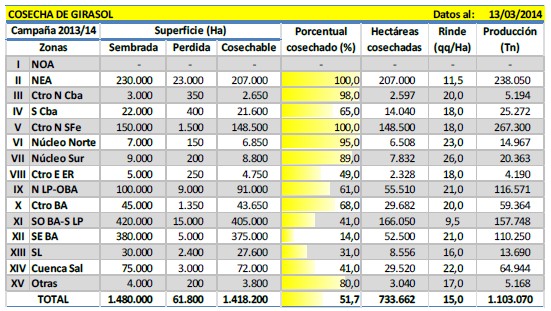 Bajo este panorama, luego de haberse implantado una superficie de 1,08 MHa a nivel nacional, nuestra proyección productiva para la campaña en curso es de , cifra que representa 4.300.000 toneladasuna caída interanual del -4,5% (campaña 2012/13: 4,5 MTn).