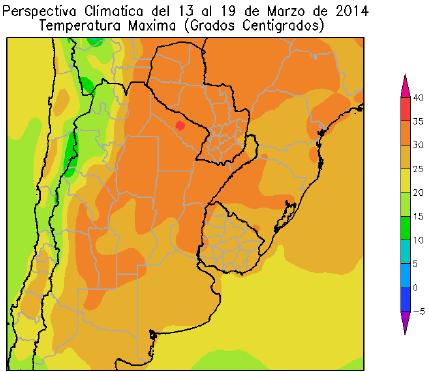 El norte del área agrícola argentina y la mayor parte del área agrícola paraguaya observarán temperaturas máximas superiores a 30°C. El centro del NOA, la mayor parte de Cuyo, la mayor parte de la Región Pampeana, el norte de Misiones y la mayor parte del Uruguay, experimentarán temperaturas máximas entre 25 y 30C.
