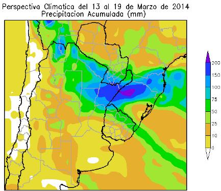 La perspectiva comenzará con vientos del sector norte, que causarán temperaturas sobre lo normal, e incrementarán el contenido de humedad de la atmósfera. Hacia el fin de semana, se producirá el paso de un frente de tormenta, que provocará precipitaciones de muy variada intensidad en gran parte del área agrícola, con riesgo de tormentas severas sobre el norte de su extensión. El paso del frente de tormenta traerá vientos del sud/sudeste que provocarán un marcado descenso de la temperatura en la mayor parte del área agrícola.