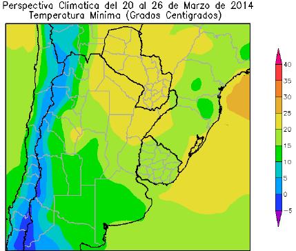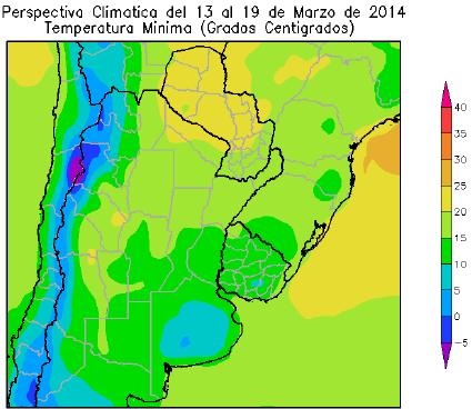 El centro-este del NOA, la mayor parte de Cuyo y el oeste de la Región Pampeana, observarán temperaturas mínimas entre 10 y 15ºC. El centro-oeste del NOA y el oeste de Cuyo observará temperaturas mínimas entre 5 y 10ºC. El oeste del NOA y el extremo oeste de Cuyo observarán temperaturas mínimas bajo 0ºC.