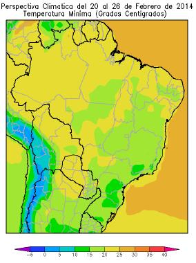 El sur de Pará, el noroeste y sudeste de Mato Grosso do Sul, el sudeste de Tocantins, el sur de Piauí, el sur de Maranhao, el centro de Mato Grosso do Sul, la mayor parte de los Estados de Bahía, Goias, Mina Gerais, Sao Paulo, Paraná, Santa Catarina y Río Grande do Sul, registrarán temperaturas mínimas entre 15 y 20ºC.