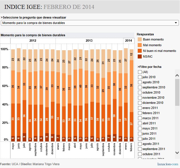 La baja respecto de enero fue de 26,8%, y de 24,9% respecto de febrero de 2013. Según los analistas que realizan la encuesta, esto fue producido por la devaluación y la desaparición de los planes de cuotas para realizar compras de bienes durables.