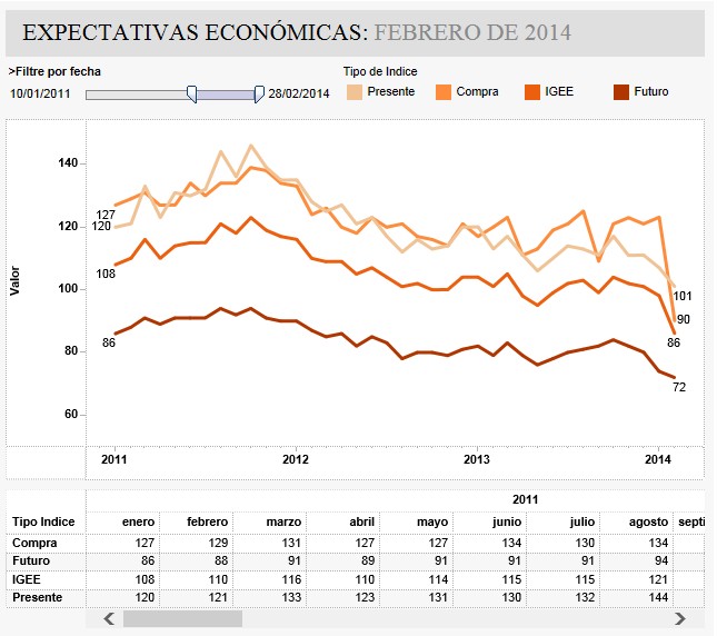 El índice general de expectativas económicas que miden la Universidad Católica Argentina (UCA) y TNS-Gallup cayó 12 puntos entre enero y febrero. Una baja de semejante magnitud no se daba desde octubre de 2008, en medio de la crisis con el campo, el momento más complicado de la crisis financiera internacional y el desplome del comercio mundial de mercaderías. En aquel momento la caída del indicador fue de 15 puntos.