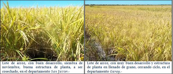 En el área arrocera (departamento Garay y departamento San Javier), la alternancia de días soleados y la disminución de los porcentajes de humedad permitieron avanzar con el proceso de cosecha, pero un nuevo frente de tormenta, inestabilidad y precipitaciones, frenaron el mismo que se reanudo en estos días.