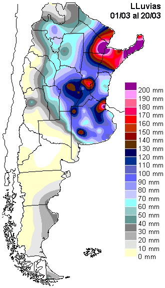 En el mapa se representan las lluvias acumuladas durante lo que va del mes de marzo. Con claridad resalta el máximo en el centro este de CB y el centro de SF, comportamiento que tomó parte de las vecindades de ER, decayendo hacia el este. También aparecen otros máximos destacados en torno de la ciudad de Buenos Aires, Villegas, Pigué y Las Flores. Las lluvias son moderadas pero ya habiendo alcanzado los valores normales del mes, en gran parte del resto de la provincia. Mención aparte para el comportamiento de Chaco y el este de Santiago, donde las lluvias han terminado de fortalecer un cierre de campaña que sin dudas dejara los mejores resultados de por lo menos el último lustro. Hacia el este las precipitaciones se vuelven excesivas, aunque las mismas son favorables en territorio Misionero donde hasta ahora habían prevalecido en niveles deficitarios. Son mayormente pobres las lluvias en el NOA, donde las mismas han comenzado a mostrar un retroceso quizá antes de lo previsto. En conclusión, queda claro que sectores del este de CB y del centro de SF, se han visto perjudicado por estas ocho semanas seguidas donde en todas se observaron jornadas con precipitaciones, dentro de un contexto ambiental muy húmedo y con baja tasa de radiación. Este comportamiento fue menos dañino sobre otros sectores de la zona núcleo, donde igualmente se padeció la continuidad del ambiente húmedo hasta la jornada de ayer. El patrón seco que acompaña la entrada de aire frío de mañana, parece dar un respiro de buen tiempo para gran parte del país.