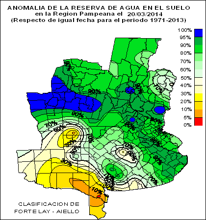RESERVA DE AGUA ÚTIL EN EL SUELO (como % de la capacidad de agua útil total) en la Región Pampeana el 20 de Marzo de 2014