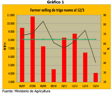 En un contexto en el que el gobierno ha autorizado por el momento 1,5 millones de toneladas (mill tt) de exportaciones de trigo para el ciclo 13/14 (dejando nuevamente el mercado brasileño a manos de EEUU), y que la molinería estaría stockeada en términos generales hasta abril (ya ha comprado aproximadamente 2 mill tt, en línea con la evolución histórica), no sorprende que estemos asistiendo a un mercado con escaso dinamismo en términos de comercialización.