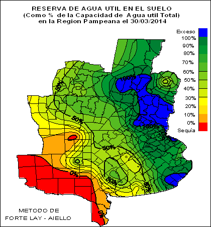RESERVA DE AGUA ÚTIL EN EL SUELO (como % de la capacidad de agua útil total) en la Región Pampeana el 30 de Marzo de 2014
