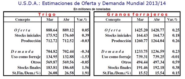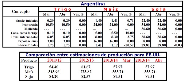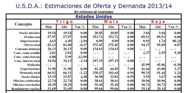 El Departamento de Agricultura de los Estados Unidos (USDA, por sus siglas en inglés), relevó un nuevo informe de oferta y demanda mundial de granos en el que más allá de reconfirmar la baja de stocks en Norteamérica para la campaña 2013/14 (los stocks finales de soja quedaron en 3,67 M/Tns.) el dato sorpresivo, en concepto de estimaciones mundiales, fue el recorte de producción de soja para Brasil en 1 millón de toneladas (M/Tns.) quedando en 87,5 m/Tns., al tiempo que se incrementó la producción de maíz en ese país, en 2 M/Tns., fijándose esta última en 72,0 M/Tns.