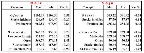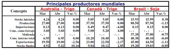 A continuación, los datos más relevantes del reporte mensual de oferta y demanda global de granos de abril del USDA, con cuadros elaborados por la Bolsa de Cereales de Buenos Aires:
