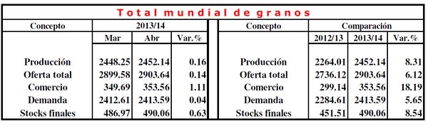 La producción mundial de cereales totalizará 2.452,14 M/Tns. en la temporada 2013/14, desde los 2.448,25 M/Tns. estimados el mes pasado, lo que incluiría 712,52 M/Tns. de trigo, 1.264,04 M/Tns. de granos para forraje y 475,57 M/Tns. de arroz., según informó la agencia Reuters.