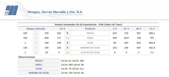 Luego de que el miércoles 9/4, el Departamento de Agricultura de los Estados Unidos (USDAS, por sus siglas en inglés), difundiera un nuevo reporte mensual sobre Oferta y Demanda de Granos en el nivel Mundial, en donde se redujeron los volúmenes de las existencias finales estadounidenses de maíz y soja y se aumentaron las de trigo, al tiempo que se dieron cambios en las cifras de las cosechas de granos gruesos en Brasil (un millón menos de toneladas para soja) y no demasiados cambios para la Argentina, el jueves 10 de abril dio a conocer su reporte de Exportaciones semanales con semana finalizada al 3 de abril, en donde las ventas de trigo 2013/14 resultaron inferiores a las expectativas del mercado, totalizando 41.800 toneladas (Tns.).