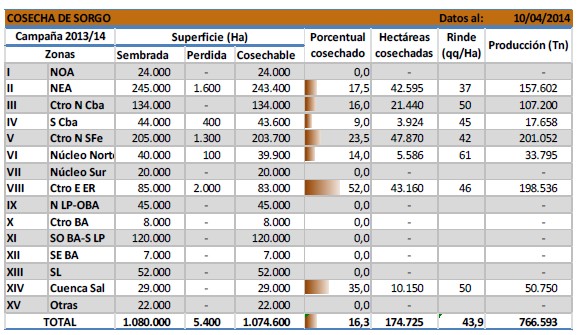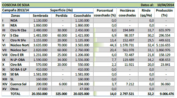 En consecuencia, a la fecha se estima que la cosecha cubrió el 14 % del área apta, marcando un adelanto intersemanal de sólo 4,5 % y registrando un atraso interanual de -10 %, como consecuencia de la interrupción en la recolección. En números absolutos, luego de recolectarse poco menos de 2,8 MHa, el rinde medio nacional se ubica en 32,2 qq/Ha y el volumen parcial acumulado asciende a 9 MTn.