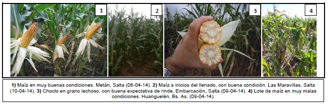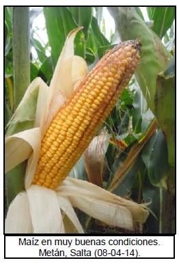 Cabe destacar las muy buenas condiciones que presentan los maíces en el extremo norte del área agrícola nacional. En la zona del NEA hoy se proyectan productividades que superarían ampliamente los rendimientos históricos regionales. Las lluvias acompañaron de manera satisfactoria el ciclo del cultivo. Hoy el grueso de los cuadros transita llenado de granos, con expectativas de lograr rindes puntuales que superen los 100 qq/Ha. En el NOA, más precisamente en Salta, si bien las perspectivas a cosecha son muy buenas las lluvias se dieron de forma heterogénea, y hoy se puede visualizar una diferencia en el estado del cereal entre los departamentos de Orán, Metán, Anta y Rosario de la Frontera. El extremo norte presenta óptimas condiciones de cultivo, no así el departamento de Anta, en donde las lluvias durante el mes de marzo fueron escasas y el maíz en su gran mayoría transitaba el período crítico de generación de rendimiento.