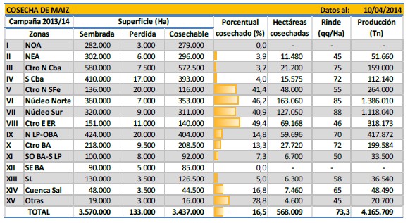 Por último el Centro-Norte de Córdoba denota óptimas condiciones en los materiales de siembras tardías, estimando productividades superiores a los promedios históricos zonales. A su vez, a nivel sanitario se relevaron severos ataques de tizón, los cuales fueron controlados mediante aplicaciones con fungicida. Frente a este escenario mantenemos nuestra actual proyección en 24.000.000 toneladas; no se descarta que esta proyección pueda ser ajustada en nuestros próximos informes, a causa de las pérdidas potenciales por anegamiento. De lo contrario, la producción estaría un -11 % por debajo de lo recolectado la pasada campaña (2012/13 27 MTn).
