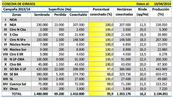 Previo a las lluvias en el Norte de La Pampa-Oeste de Buenos Aires los productores lograron cosechar los cuadros que estaban en madurez comercial. Las productividades obtenidas en esta amplia región fueron muy dispares, y las mismas estuvieron sujetas a dos factores: por un lado, la gran variabilidad de humedad en los cuadros durante todo el ciclo, y por el otro, la disparidad en las fechas de siembra. Las tardías fueron las que mejores productividades lograron, permitiendo alcanzar un rendimiento promedio al cierre de campaña de 22 qq/Ha. En el Centro de Buenos Aires también ha finalizado la trilla de este importante cultivo durante la última semana. El rendimiento promedio se ubica en los 20 qq/Ha, dado que el girasol alcanzó un buen desarrollo en la región ya que se benefició con la gran reserva de humedad que disponían los perfiles.
