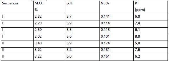 Tabla 1. Análisis de suelo inicial. Materia orgánica (M.O.), pH, Nitrógeno total (Nt) y fósforo (P). Al inicio del estudio para el espesor 0-20 cm del suelo.