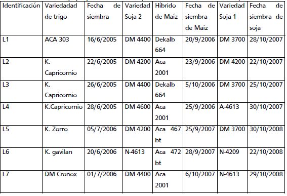 Tabla 2. Variedad de trigo y soja e híbrido de maíz, fecha de siembra de cada sitio experimental.