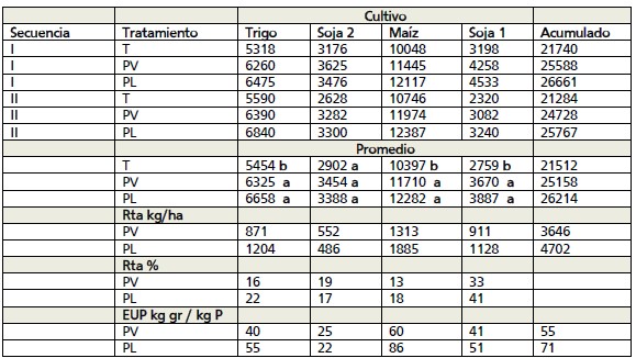 Tabla 4. Rendimiento promedio anual por secuencia y promedio general. Respuesta a la fertilización de P (kg ha-1 y %) y Eficiencia de uso del P (EUP kg gr/ kg de P).