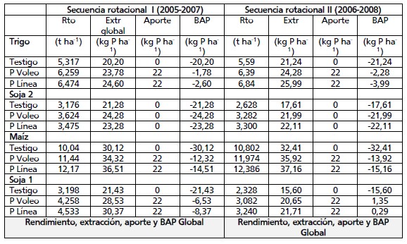 Tabla 5. Rendimiento (Rto) de los cultivos, extracción de P por los cultivos (Extr.), P aportado por la fertilización y balance aparente de P (BAP) anual y global de cada secuencia, según modalidad de aplicación del P.