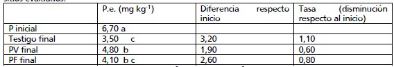 Tabla 6. Fosforo extractable (P.e. mg kg-1) al final de la secuencia de cultivos. Promedio de todos los sitios evaluados.