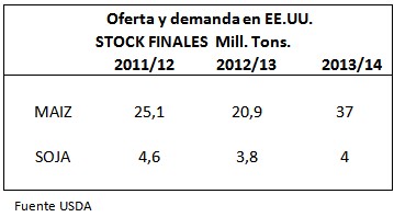 De acuerdo a las previsiones del USDA para EE.UU, habría una baja en la superficie de maíz a favor de la soja. Tales previsiones se fundamentan en el cuadro de oferta y demanda que resulta en los stocks finales para este año.
