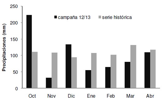 Las precipitaciones registradas durante el ciclo del cultivo (700 mm) fueron similares al promedio histórico registrado en el partido durante el período 1971-2011 (772 mm). Las elevadas precipitaciones registradas entre octubre y diciembre posibilitaron un excelente desarrollo vegetativo (Tabla 2). Durante el mes de enero las precipitaciones fueron inferiores al promedio y la segunda parte del período crítico (floración + 15 días, segunda quincena de enero) se desarrolló bajo déficit hídrico (Figura 1).
