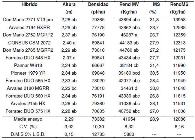 En el estado de R2 (09 de febrero de 2013) se realizó el conteo de plantas por parcela y se determinó la altura final sobre 10 plantas elegidas al azar en cada parcela. El 2 de marzo de 2013 se cosechó la totalidad de cada parcela (588 m2) mediante la utilización de una picadora autopropulsada, determinando la producción de materia verde. La mayoría de los materiales al momento del picado se encontraban en estado de grano pastoso. Los resultados fueron procesados mediante un análisis de varianza (ANOVA) y la diferencia mínima entre medias de tratamientos mediante una prueba L.S.D., indicando diferencias mínimas significativas (p<0,05). Adicionalmente, se tomó una alícuota de 500 g en cada híbrido, la cual fue enviada a laboratorio para la determinación de los parámetros de calidad [Porcentaje de proteína (PROT); porcentaje de almidón (ALM), digestibilidad de la materia seca (Digest) y energía metabolizable (EM)].