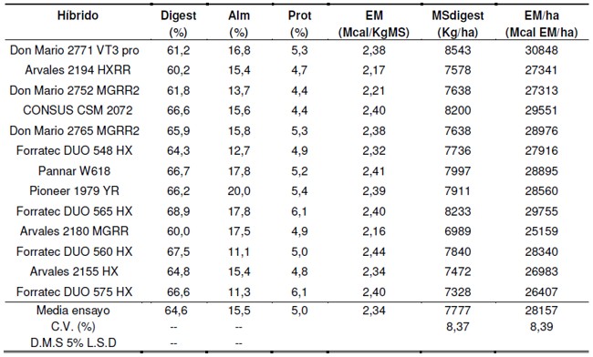 En la tabla 3 se observan los valores de digestibilidad de la materia seca (Digest), porcentaje de almidón (ALM); porcentaje de proteína (PROT) y energía metabolizable (EM) para cada híbrido. En todos los híbridos se observaron buenos valores de digest (>60%) y EM (>2,10 Mcal/KgMS) con bajos valores de proteína.