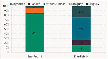 Buscando responder este interrogante empezamos a buscar día a día desde inicios de febrero el origen de las compras de trigo de Brasil en lo que va de 2014 y después de estos meses apareció el dato de la Comisión Nacional de Abastecimiento, expresado tristemente en el gráfico que sigue:
