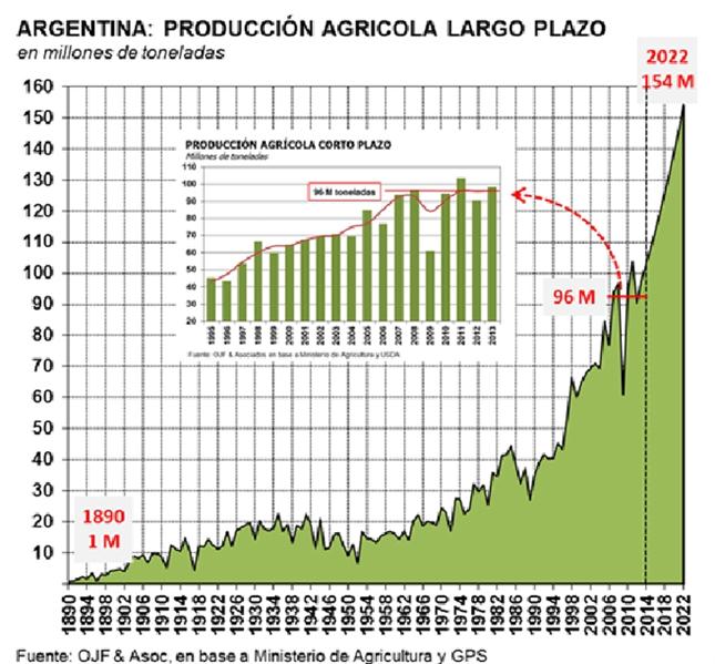 El gran aporte de los agricultores fue modernizarse y hacer crecer el volumen físico de producción de su sector desde 1 millón de toneladas en 1890 hasta los 96 millones de toneladas en promedio actuales. Esto fue logrado a pesar de las trabas que se impusieron desde los gobiernos en algunos períodos. El impacto de estas políticas se puede apreciar en el gráfico de largo plazo observando la reducción de volúmenes o su estancamiento en los períodos respectivos y también comparando con los crecimientos en otras etapas.