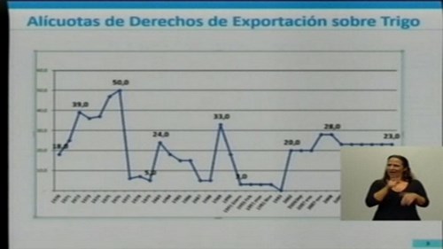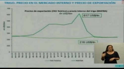 Cristina también habló de las alícuotas de derechos de exportación de trigo, diciendo que las mismas estaban dispuestas ya desde 1970, y mencionó que en la cosecha 1976/77 la alícuota alcanzó más del 50%. "Al año siguiente, en 1977, en la época de Martínez de Hoz como ministro de economía, se bajaron en 5% las alícuotas. Sin embargo ese año se produjo la cosecha más baja de trigo para la época. Y en esto tuvo mucho que ver la disparada del dólar”, alegó la mandataria. Y siguió repasando los años, alegando que en ese tiempo también se cobraron derechos de exportación de trigo.