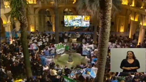 La presidenta de la Nación, Cristina Fernández, habló por cadena nacional desde el Salón de las Mujeres Argentinas del Bicentenario, de la Casa de Gobierno, y con la asistencia de miembros del Gabinete nacional y otras autoridades nacionales, provinciales e invitados especiales, realizó una batería de anuncios que incluyó la firma de convenios de reestructuración de la deuda pública con 17 provincias, la creación del Fondo para el Desarrollo Económico Argentino (FONDEAR)- una línea de créditos productivos- y el lanzamiento de una tarjeta del Banco Nación para las empleadas domésticas registradas.