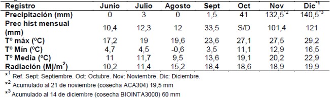 Tabla I. Registros meteorológicos durante el ciclo de ensayos de aplicación de fungicidas en Trigo.