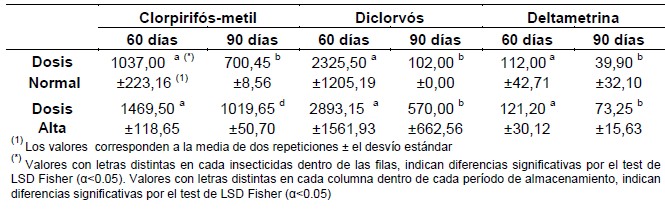 Tabla II. Niveles de residuos de tres insecticidas (μg/kg) aplicados en dos dosis en almacenamiento de granos de maíz a los 60 y 90 días desde su aplicación.