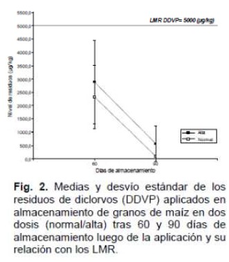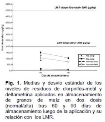 En conclusión, utilizando las prácticas habituales de manejo de los insecticidas diclorvos y deltametrina más clorpirifós metil aplicados en almacenamiento de granos de maíz, luego de 60 días de almacenamiento ya no se encuentran residuos de plaguicidas que superen los límites máximos residuales. Con respecto a la aplicación del fungicida tebuconazole en el cultivo de trigo, es necesario considerar las condiciones ambientales del año ya que es posible que aún respetando las indicaciones de uso, en años secos se encuentren niveles de residuos en los granos por encima de los LMR. Es necesario continuar con estudios que permitan determinar el análisis de riesgo asociado a los niveles de residuos de los plaguicidas utilizados en el almacenamiento y a campo.