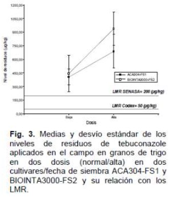 Tabla III. Niveles de residuos de tebuconazole (ug/kg) aplicado en dos dosis en granos de trigo de dos cultivares, ACA 304 y BIOINTA 3000, respectivamente.