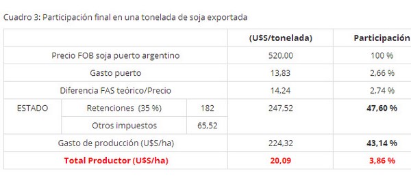 En base al porcentual por hectárea –con un rendimiento promedio de 28 qq- podemos calcular como se distribuye la participación de cada uno de los actores de la cadena por tonelada de soja exportada (Cuadro 3)