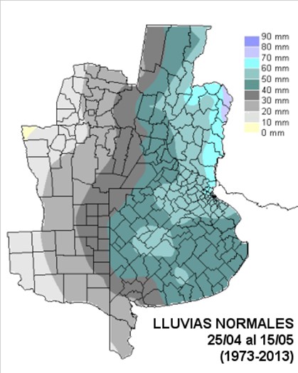 Si bien es cierto que a lo largo del último semestre el comportamiento de las precipitaciones ha mostrado conductas extremas, alternado varios períodos secos con otros muy húmedos, esta última parte de abril viene mostrando una moderación de esa tendencia. Partiendo de esa premisa y considerando que las precipitaciones desde ahora hasta mediado de mayo podrían comportarse en torno de los valores normales, es interesante plantear cual sería el estado de reservas para el inicio de la campaña triguera si esto sucediera. Para ello, lo primero es buscar, considerando las estadísticas de los últimos cuarenta años, cual es el mapa de lluvia normal para los próximos veinte días. El mapa que se obtiene es el siguiente.