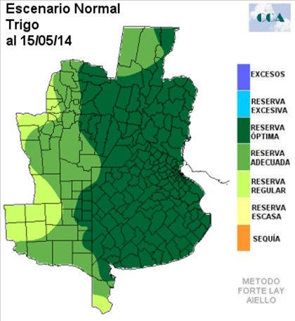 Suponiendo esta situación ideal, la mayor parte de las zonas trigueras de la región pampeana arrancarían la segunda quincena de mayo con óptima disponibilidad de humedad. Es decir las lluvias normales generan un escenario sobrado.