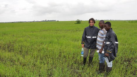 Emiliano Mroue junto a socios africanos en un campo de arroz en Sierra Leona.