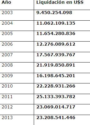 La liquidación de divisas de las empresas del sector en los últimos años fue: