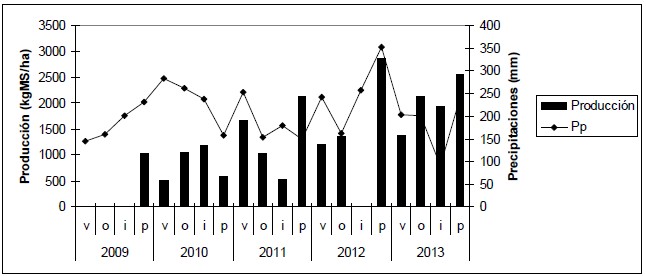 Se realizó inicialmente una descripción de ambientes separando lomas agrícolas (110 has.) de bajos, tendidos y medias lomas (136 has.). Esto permitió ordenar el manejo siguiendo un criterio de usos y descansos para lograr producciones anuales de forraje superiores a los 10000 kg MS/ha sin afectar la supervivencia del pastizal y evitando reemplazos por otro tipo de recursos forrajeros. Una de las grandes limitaciones que tienen los sistemas pastoriles es la variabilidad climática. Las precipitaciones son el principal determinante de la producción y provocan una alta variabilidad. (Figura 1)