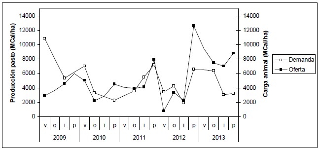 En la figura 2 se grafica producción de pasto por estación, y carga animal. Se observa que la forma de las curvas es similar y, claramente, se ve como se disminuyó la carga cuando la oferta de pasto fue menor.