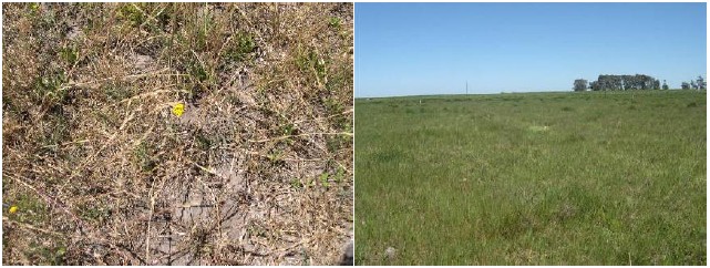 La cobertura de malezas fue variable principalmente por el régimen de precipitaciones. Así como las inundaciones controlan naturalmente las poblaciones de malezas, las sequías producen claros en la vegetación que podrán ser colonizados por malezas o especies rastreras de baja calidad forrajera. El nivel de enmalezamiento registrado en un momento dado tiene que ver con situaciones ambientales y de manejo (sobrepastoreos). Nada se puede hacer ante los eventos climáticos, pero sí se debe pensar que el pastizal se recuperará de manera favorable si el manejo previo a la situación de estrés fue el correcto, si se dejó el remanente adecuado para que las especies de interés rebroten, o se manejó de manera que en el suelo sean más las semillas de especies forrajeras que de malezas. Esto se logra descansando a fines de primavera los potreros destinados a forraje de invierno y en otoño los destinados a forraje de verano, para permitir la semillazón de las especies (Figura 3; diciembre 2008 y octubre 2009, en un mismo sitio de pastizal) .