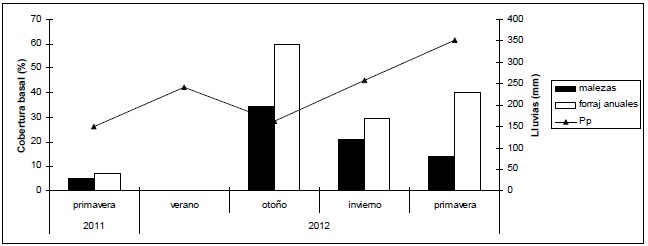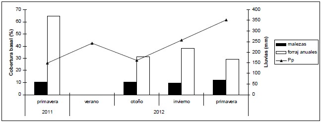 Esto se puede ver en los cuadros siguientes (Figura 4), donde después de una primavera seca, al permitirse la semillazón, en el otoño y primavera siguientes se produce un aumento de forrajeras anuales y disminución de las malezas.