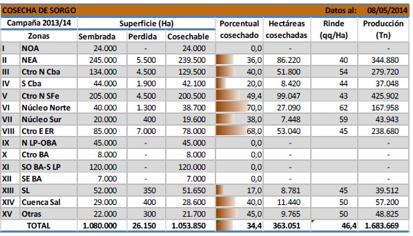 A la fecha el avance de trilla del sorgo granífero ha llegado a cubrir el 34,4 % de la superficie apta, que en números absolutos refleja una cosecha de alrededor de 360.000 Ha. Este avance se encuentra retrasado respecto de la campaña previa en -11 %, y ello se atribuye a la mayor participación de siembras tardías en el presente ciclo, a pérdida de lotes implantados en fechas tempranas y a excesos hídricos que impiden una cosecha fluida. Hasta el momento las pérdidas de área ascienden a 26 mil hectáreas, el rendimiento medio es de 46,4 qq/Ha y el volumen acumulado en chacra es de 1,68 Mtn.