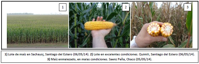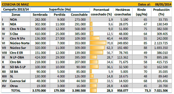 En el extremo norte del país aún no se ha comenzado a trillar el grueso del área, dado que la gran superficie implantada es de fechas tardías, del mes de diciembre y enero. En el NEA las perspectivas de rinde a cosecha son muy alentadoras, esperando obtener productividades superiores a las registradas la campaña pasada y muy por encima de la media zonal. Los rendimientos en general superarían los 70 qq/ha, con picos por encima de los 100 qq/Ha. Las precipitaciones sucedidas durante los meses de marzo y abril fueron la clave de las muy buenas condiciones que hoy presentan estos materiales. Similares condiciones se dan en el Centro-Norte de Córdoba, en donde hoy estos maíces se encuentran próximos a madurez fisiológica, a la espera de obtener rendimientos medios de 85 qq/Ha.