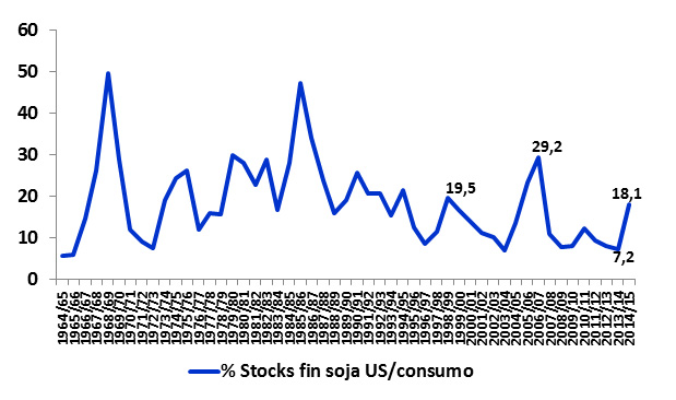 Tarde o temprano se reconstituirán las existencias limitadas, y si le creemos al USDA, ello se dará de manera violenta este año ya que los Estados-Unidos podrían casi duplicar su relación stock/consumo de soja en la campaña 2014/15.